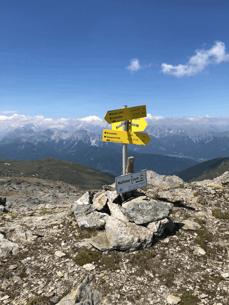 Es gab wegen dem schönen Wetter leider erst etwas später Frühstück auf der Glungezer Hütte als geplant, die Logik erschloss sich uns nicht unbedingt. Danach gab es das Briefing vom Hüttenwirt über das Wetter und die Strecke, die wir zu erwarten hatten. Wir waren die Einzigen, die über den Gipfelpfad später wieder zum Parkplatz Voldererwildbad abstiegen, alle anderen gingen weiter von Hütte zu Hütte. Wir begannen also bei 6°C und herrlichstem Wetter ca. um 08:00 Uhr unsere Tour auf dem Gipfelweg.